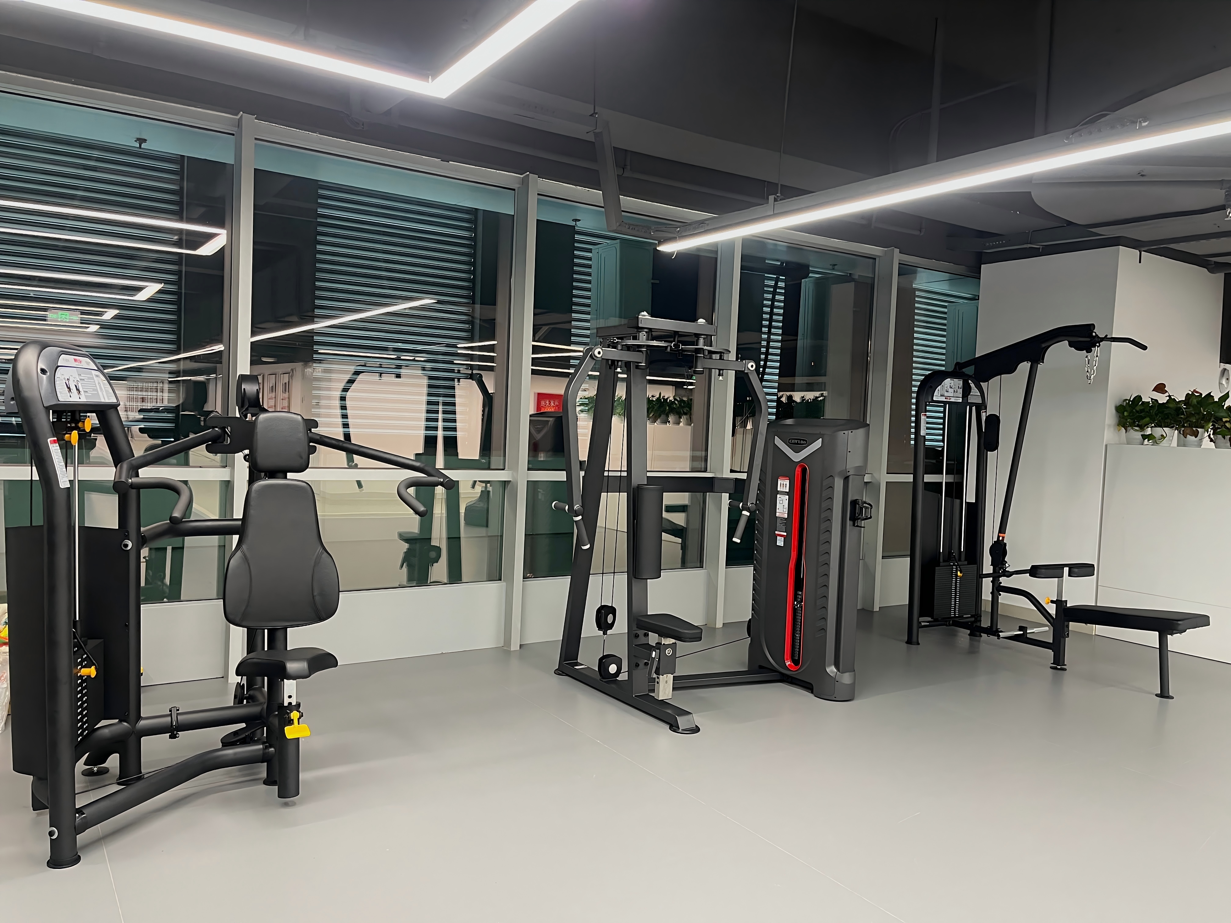 固定力量区域:配备了推肩训练器、蝴蝶机训练器、高低拉训练器、大飞鸟训练器