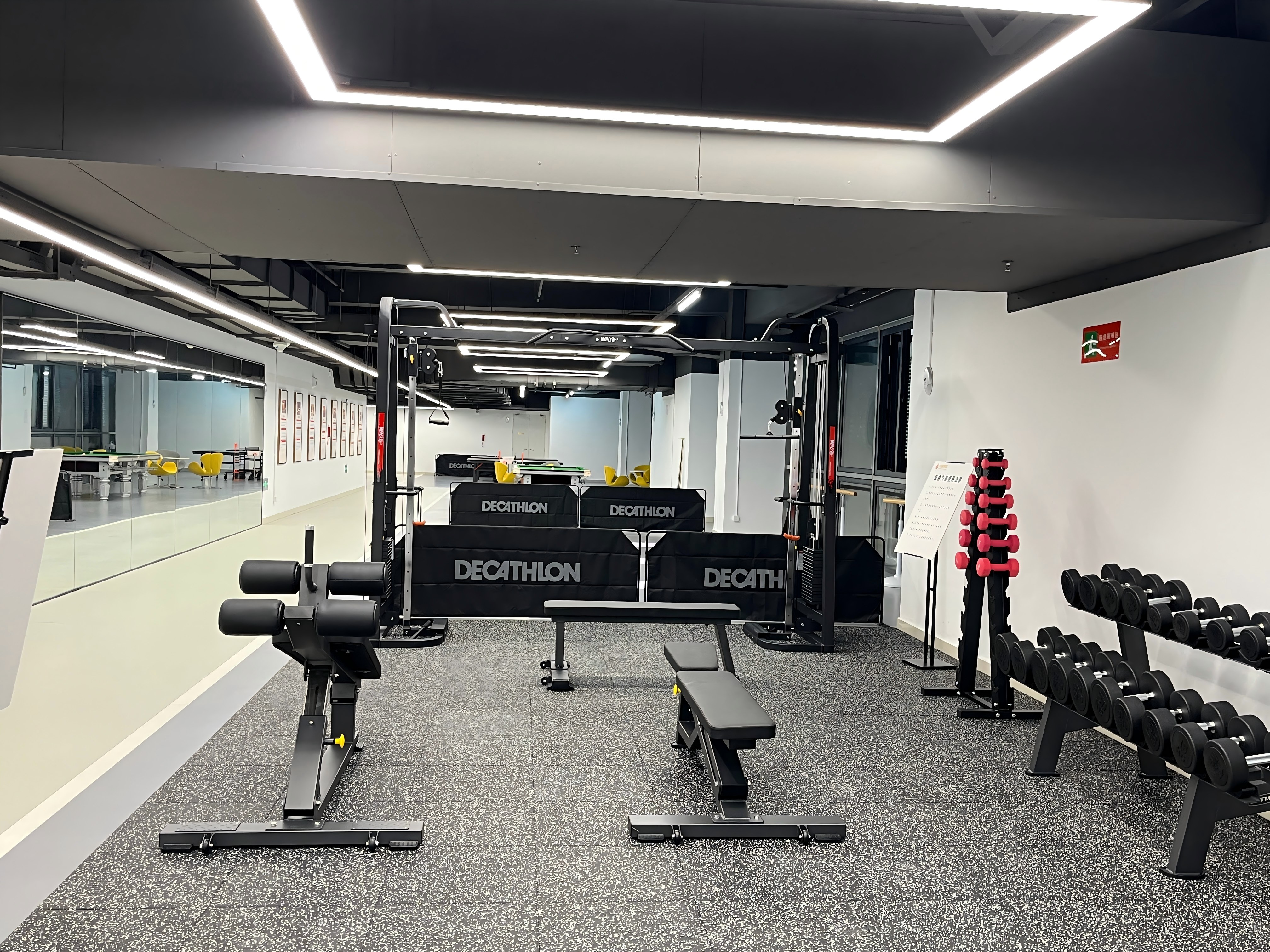 自由力量区域:配备了哑铃一套、平凳、可调凳、腹肌板